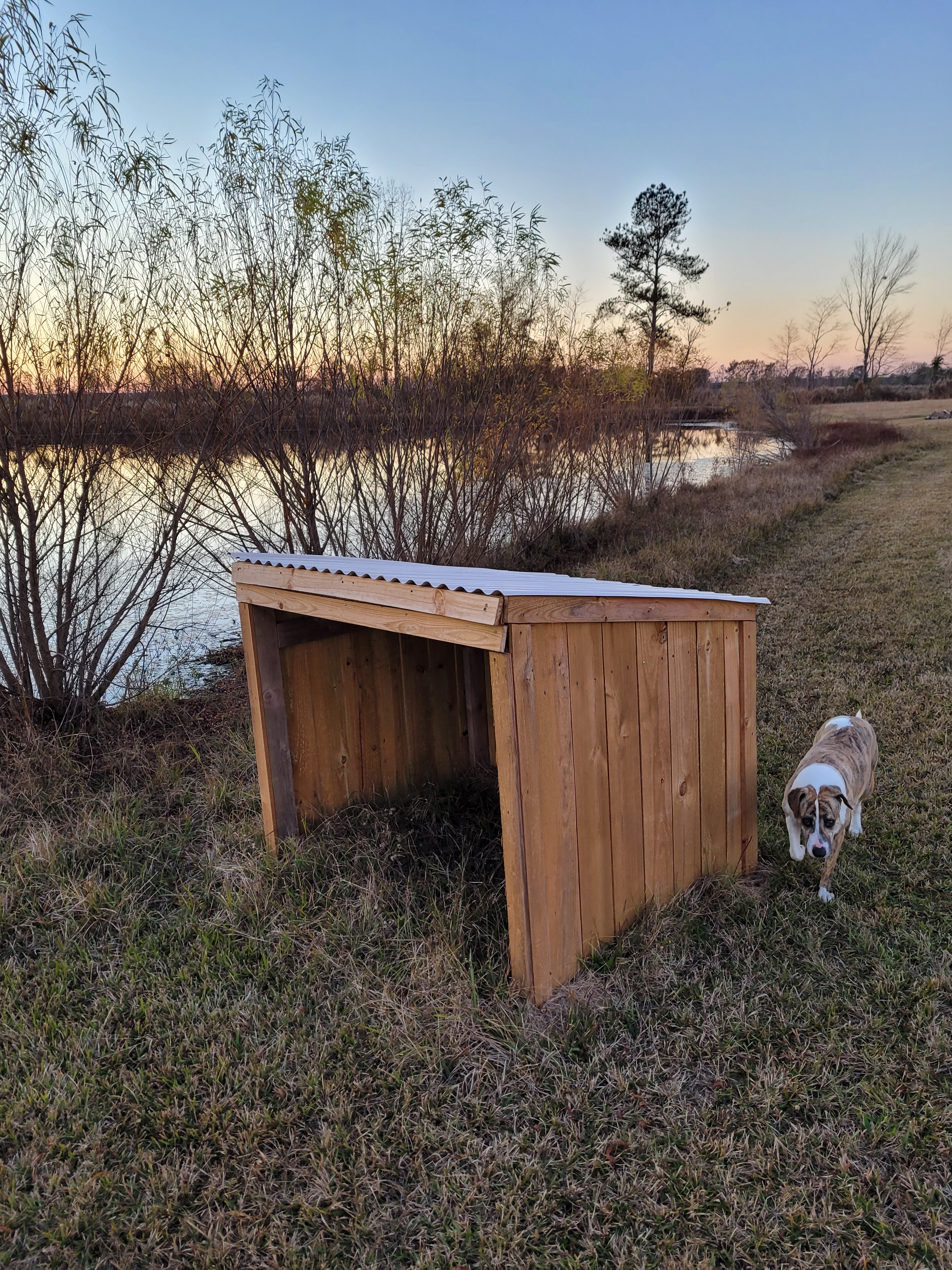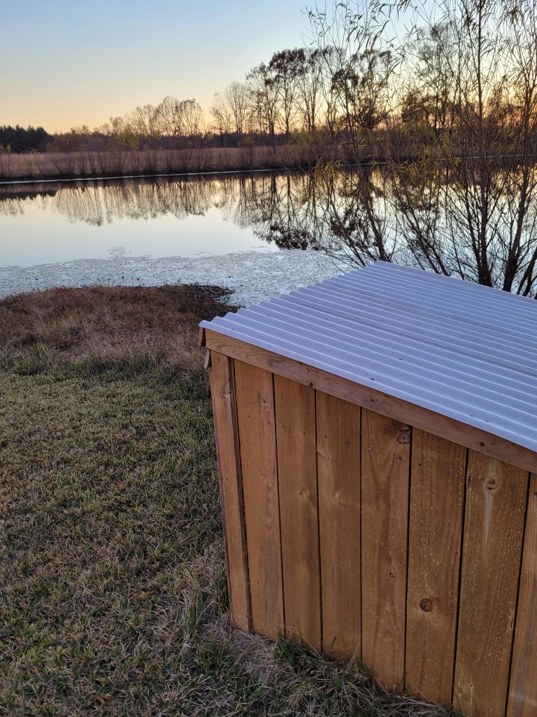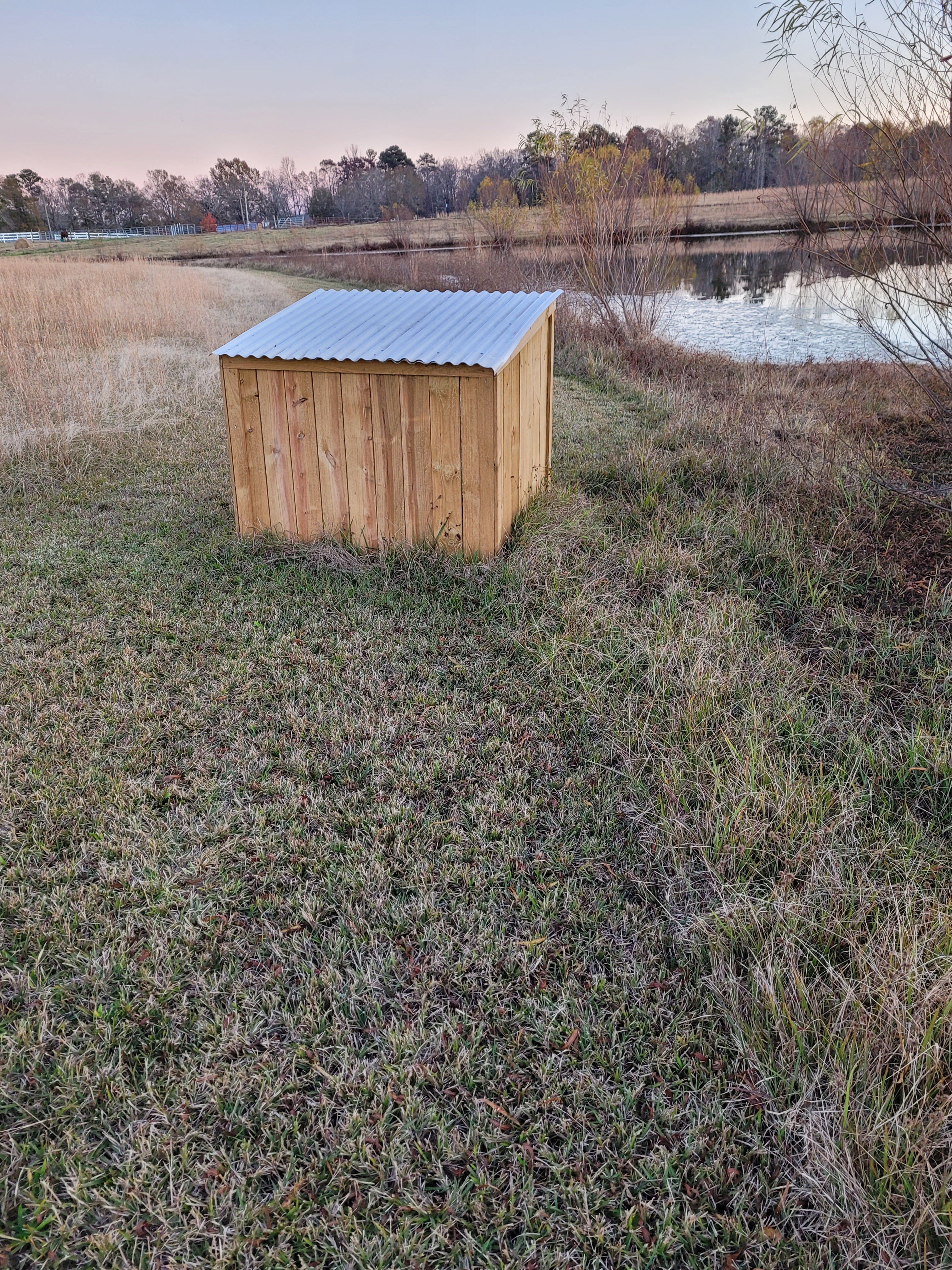 UNTIL… it got warm enough for our neighbor to open up her in ground swimming pool. As it turns out a duck, while much larger overall, is narrower than a chicken. The ducks quickly found they could slip through the fencing and found the new favorite place to sleep, in our neighbors swimming pool. The mess they made was rather impressive. I decided the fix was a simple two-part plan. First, I decided, maybe they would like a hut down by the pond and that would make them less likely to wander off property. Second was to secure the fence between us and the pool neighbor a little more so they couldn’t just slip through.