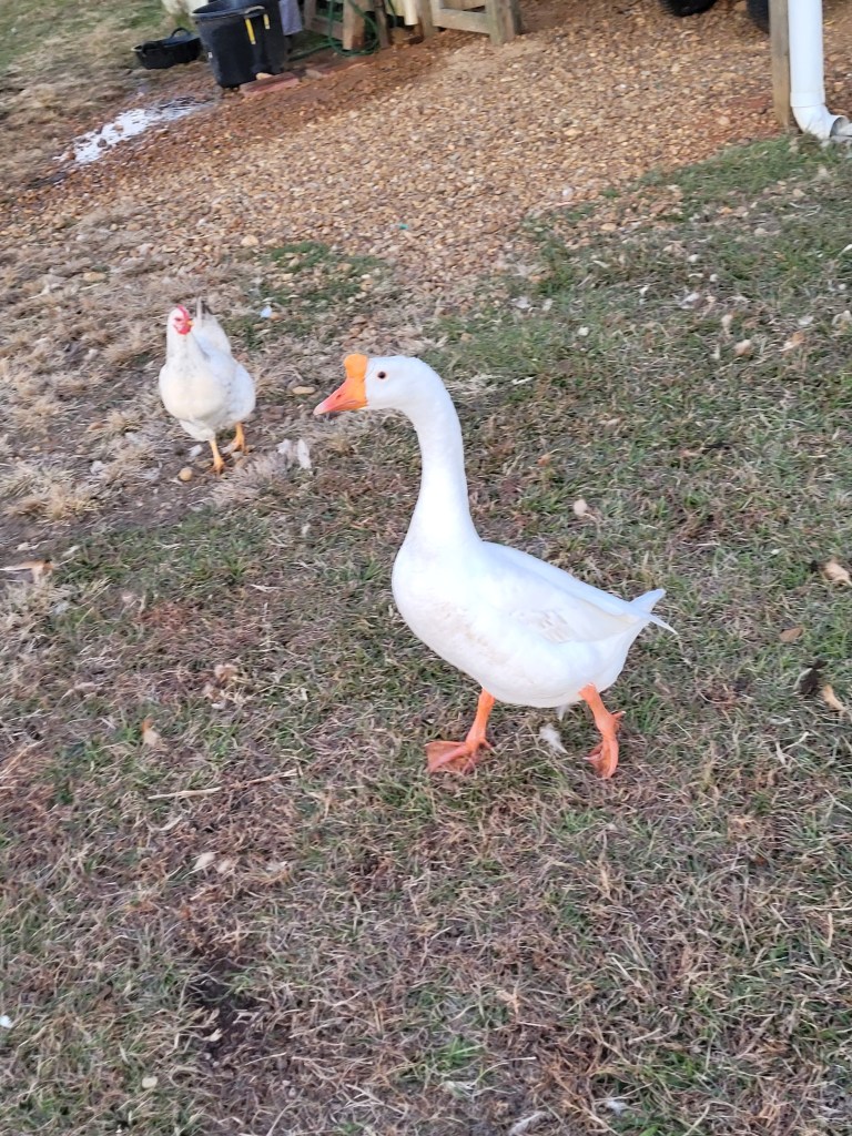 So, we did the only thing we could, we reached out to friends who had a homestead and no neighbors with a pool. They gladly accepted the gift of seven ducks to swim in their pond and be a part of their family. We kept Gandalf as a guard goose and because he can’t get out. He happily swims the pond, alerts us to intruders and on occasions herds the chickens around when they let him.