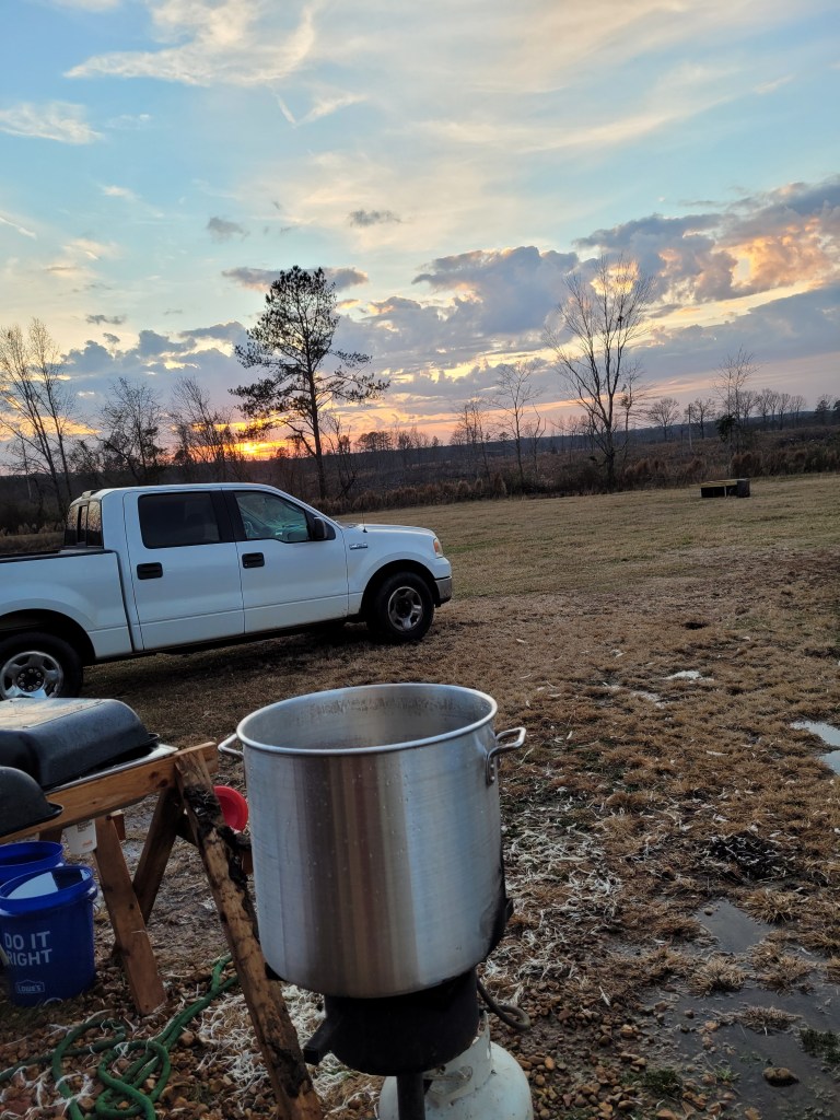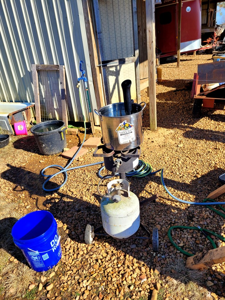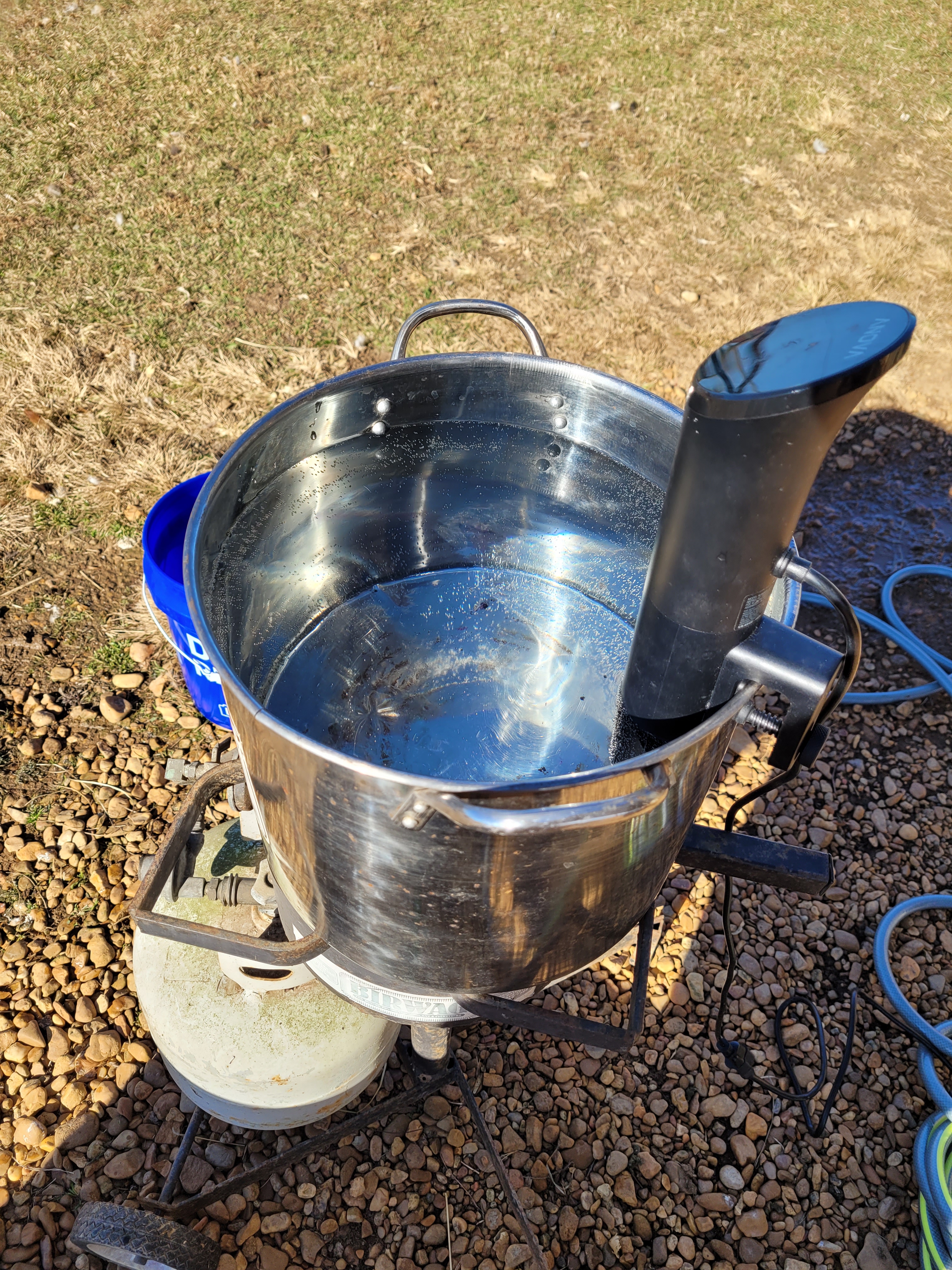 I used a propane burner and a larger stock pot the first time with a sous vide cooker as well the first day. The stock pot had too much water to quickly heat with the sous vide cooker and would over flow when the bird was added. The propane burner heated the water too quickly and it would cool too much between birds with the pot I had. Other wise the process worked great and I only lost the skin on one bird. The second day I processed I borrowed a larger pot that took longer to heat up but held its temperature better.