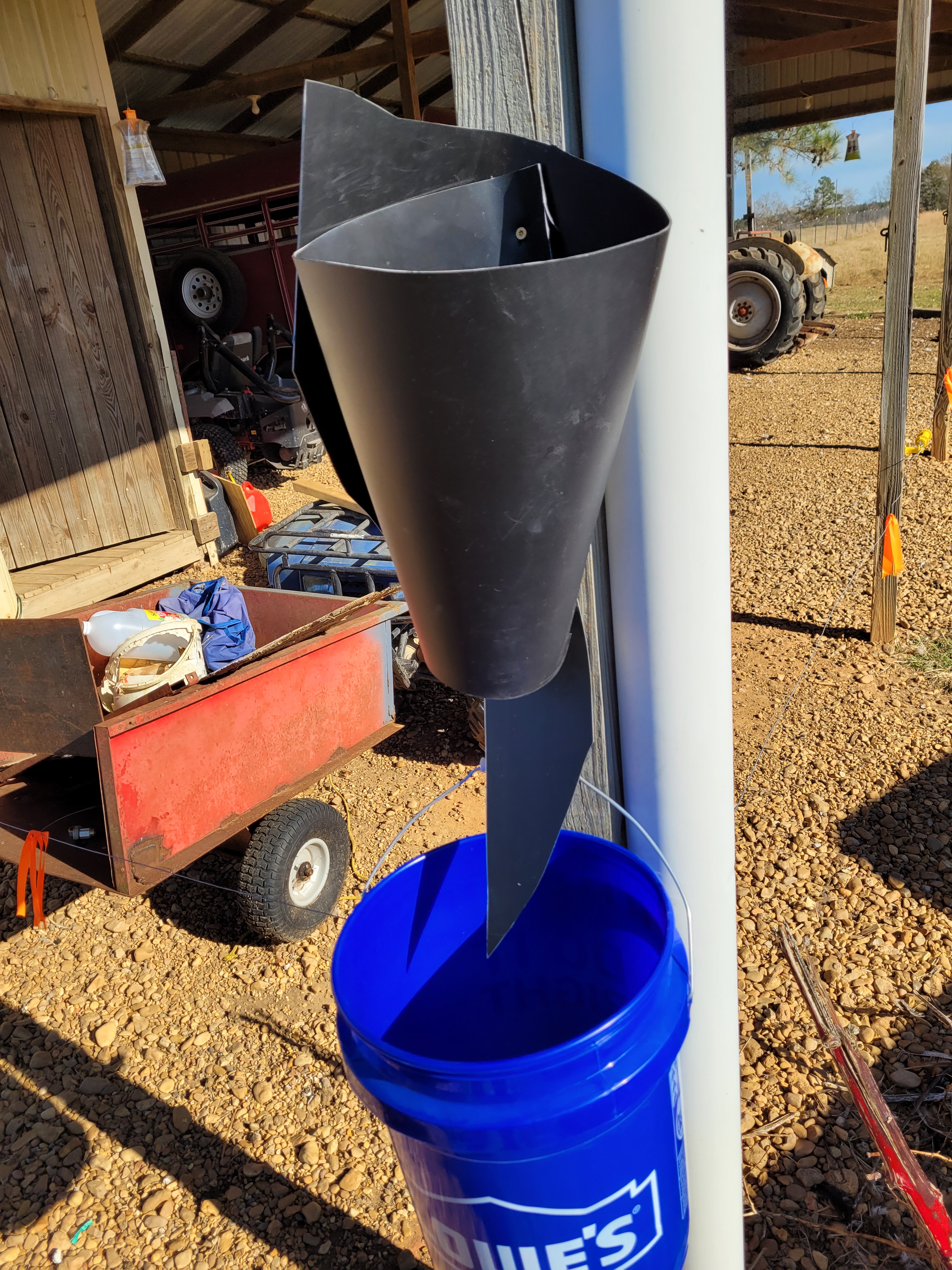 In my setup I used a killing cone I made from a plastic trashcan as a means to hold the chicken upside down to encourage blood draining and it hugs the birds tight to limit movement during death throws and also calms the bird prior to dispatching it. In addition to the cone, I hung a bucket under the cone with some water in it to catch the blood and keep it from clotting. This was collected and put into our compost pile to enrich our soil and further regenerate our land. To do the actual deed I used a sturdy fixed blade knife that I sharpened to a fine edge prior to starting.
