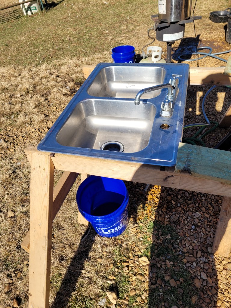 I opted to use a small drill powered plucker again to save money and while it was the right option for the time, I have already begun gathering parts for a DIY version that will handle two to three chickens or a single turkey. The drill plucker worked okay at best. It was adequate at the breast and back feathers but completely useless against wing and side feather. This resulted in a half-plucked chicken that I spent about another twenty minutes plucking by hand. This was easier with the old kitchen sink I set up on saw horses and plumbed with a water hose and a five-gallon bucket to catch the drain water.