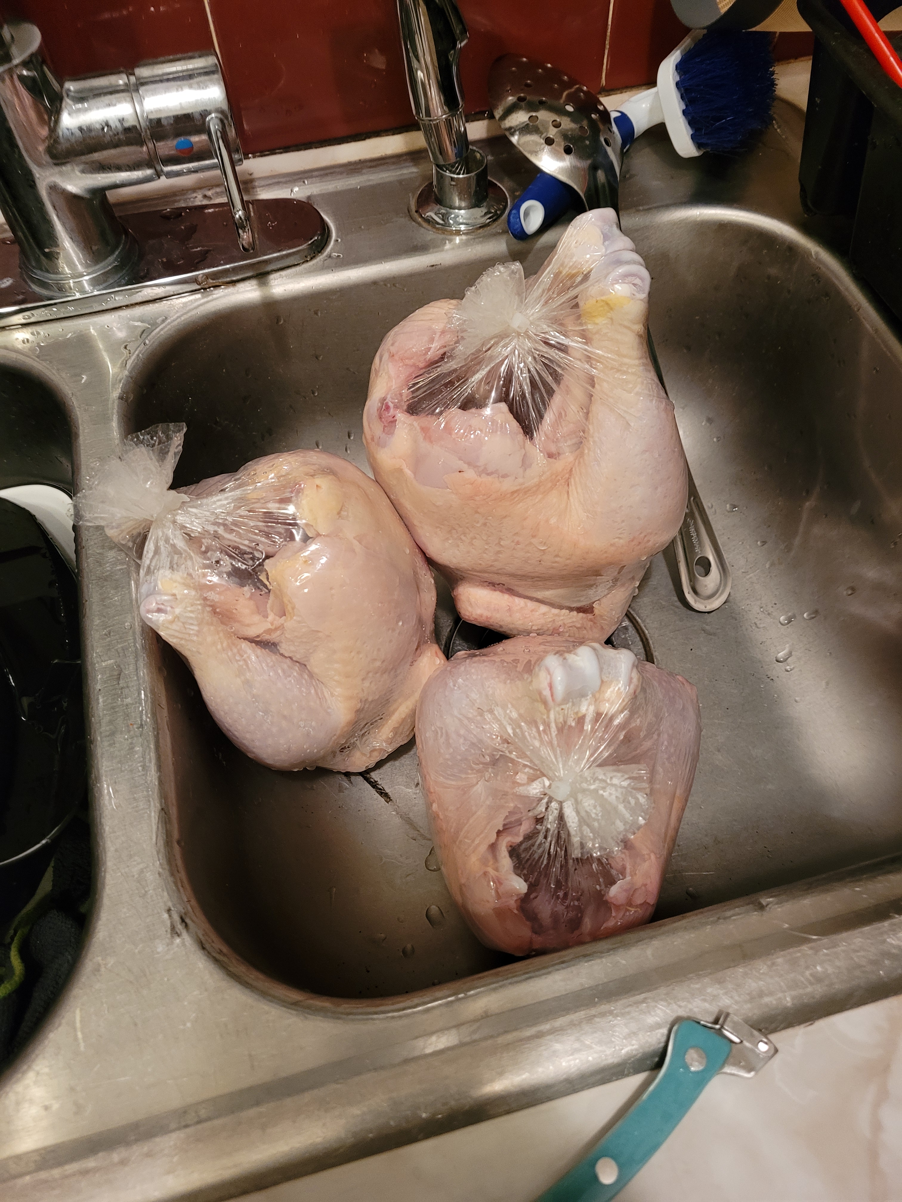 Once the chickens have been prepped for packaging, I placed them in ice water until all was done for the day and I took them in and placed them in the shrink bags. These bags, once sealed with a zip tie around a removable straw and submerged in 190°F water, shrink tight to the chicken preventing freezer burn. The first time I processed, I completed the process but when I cooked one it came out a little tough. Through research I found it is best to let them rest in ice water over night before packaging and freezing.