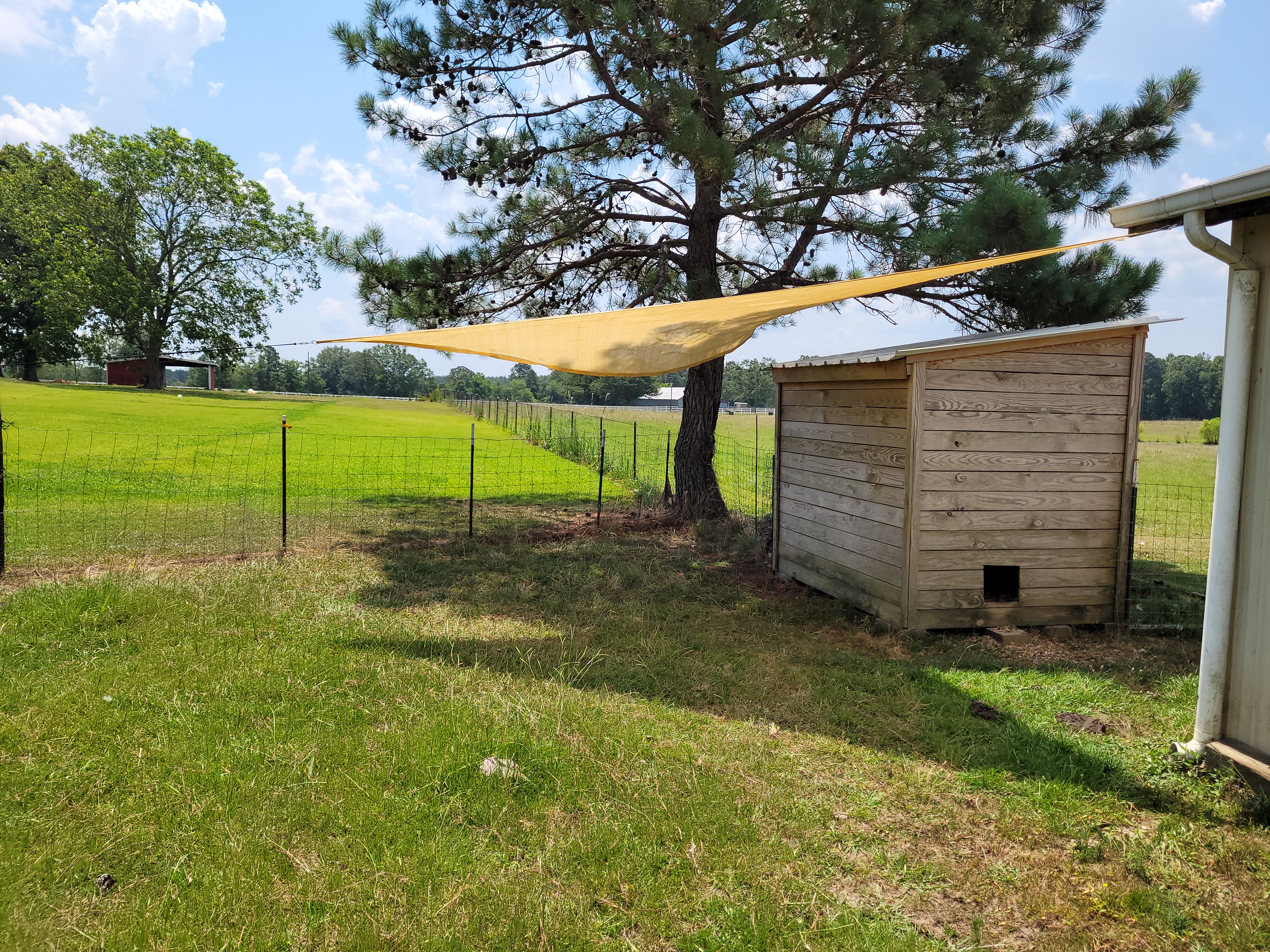 In preparation for Fred, we had to do some work around the farm. We needed a space to put Fred for a sort of quarantine and adjustment period while he gets used to the farm, us, and the rest of the animals. The stall we have in the barn is reserved for Peewee because the hot days we have been having aggravate his COPD. So we needed somewhere else for him to go where there was plenty of grass for him to eat over a week’s time and shade from this heat. With that in mind, we decided to put him behind the barn in the little fenced area back there. The only problem is there is only one small to medium sized pine tree on the east end of the paddock and nearly zero shade all afternoon.