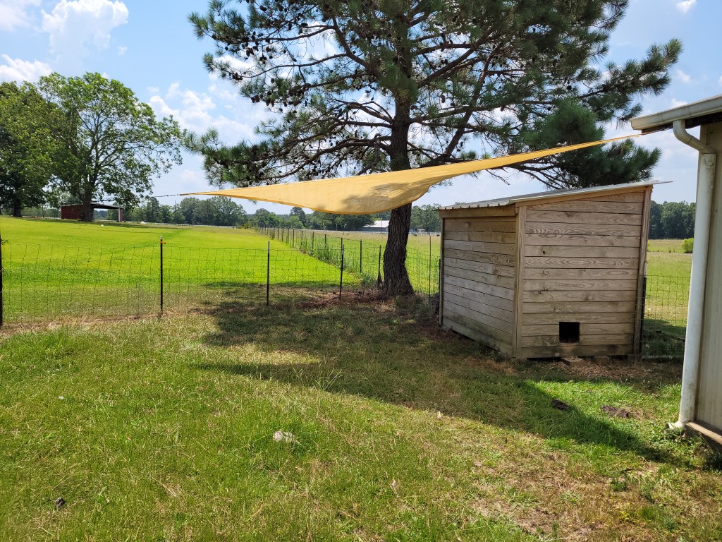 I ordered a sunshade tarp and gathered a few odds and ends to make the install easier. The sunshade is a 16’X16’X16’ triangle that I attached to the corner of the barn at the eave and anchored into the pine tree. The third leg is lower and connects to a crosstie post set in the ground a fence corner. In hind sight, I should have gone with a bigger sunshade tarp, and may still. If I do, this one can be added to our porch creating some much-needed shade in the back yard.